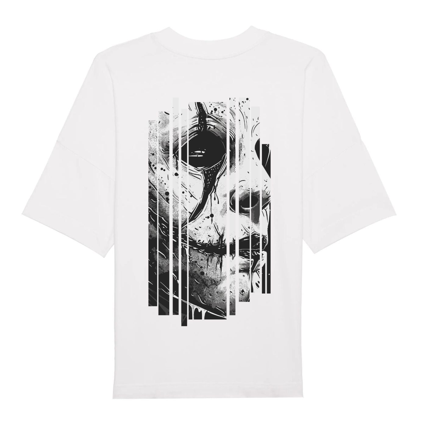 Осмели се да носиш страха си със стил. Тази бяла овърсайз тениска "Wear Your Horror" е вдъхновена от тъмната страна на изкуството – с провокативен надпис отпред и драматичен хорър дизайн на гърба. Графиката пресъздава зловещо лице, фрагментирано в изразителен черно-бял стил, който няма как да остане незабелязан.