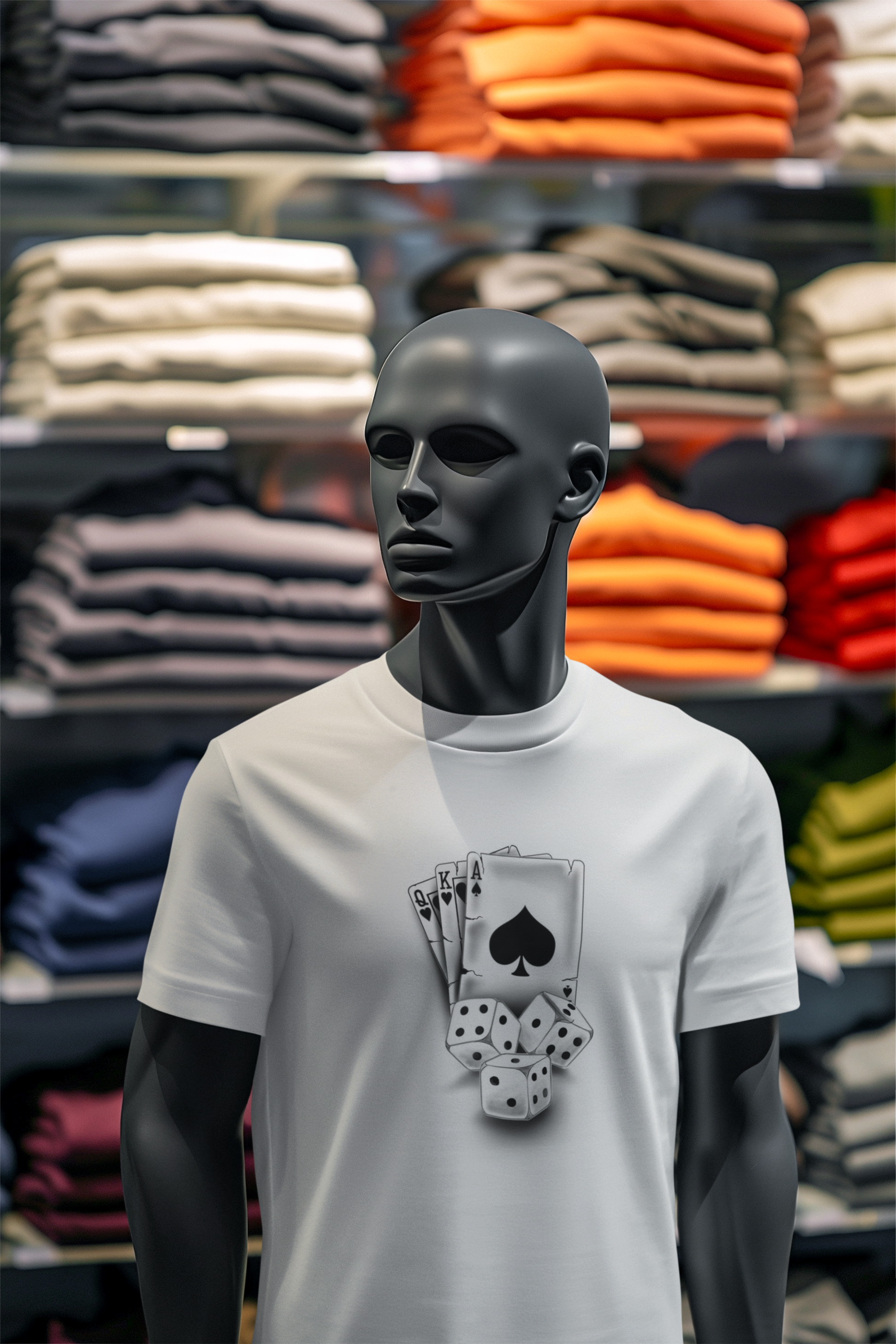 Покажи увереност и стил с тази мъжка тениска с класически покер дизайн – асо, поп и зарове, символизиращи късмета, стратегията и доминацията в играта (и в живота).