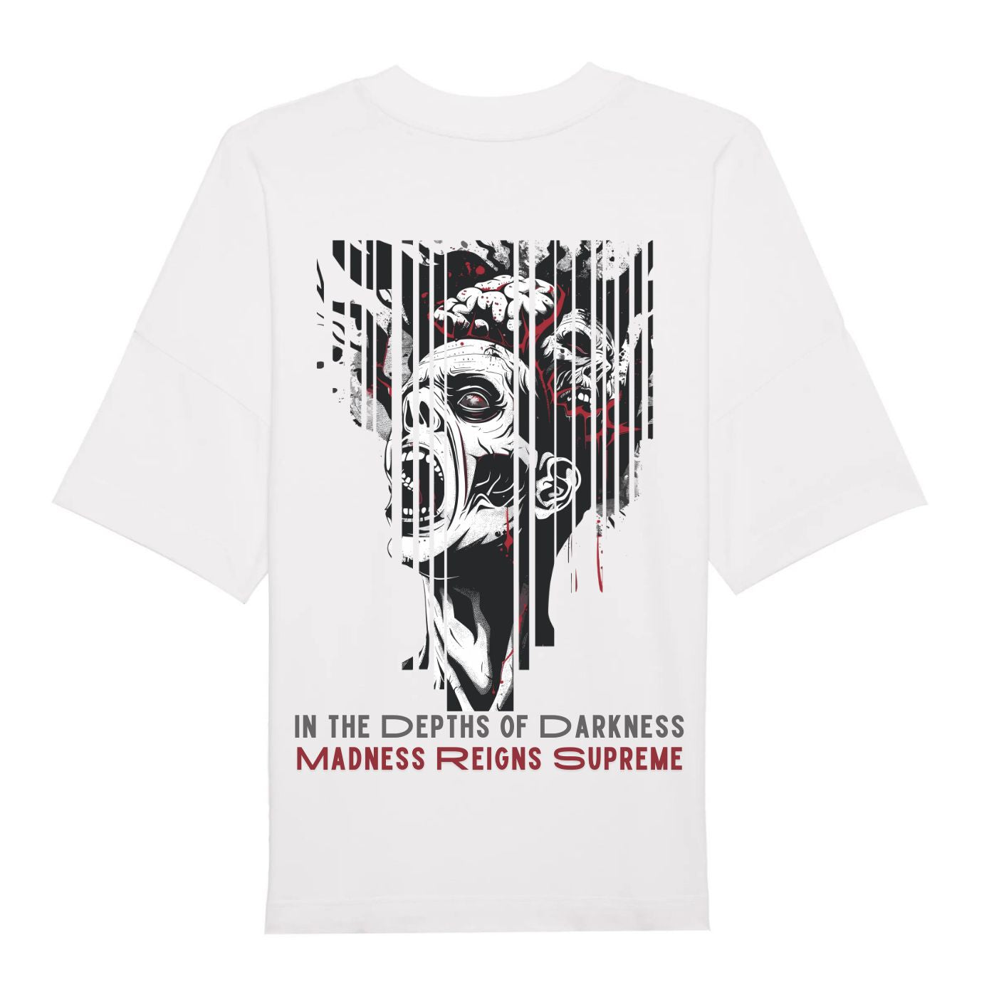 Бялата версия на Madness Reigns Supreme събира страховита визия със силно послание. Принтът показва разкрито зомби лице с изваден мозък и капеща кръв, изобразено в изчистен черно-червен стил върху бял фон. Надписът “In the Depths of Darkness – Madness Reigns Supreme” подчертава тъмната тематика, която е брандирана с “MADNESS” – за пълен хорър ефект.