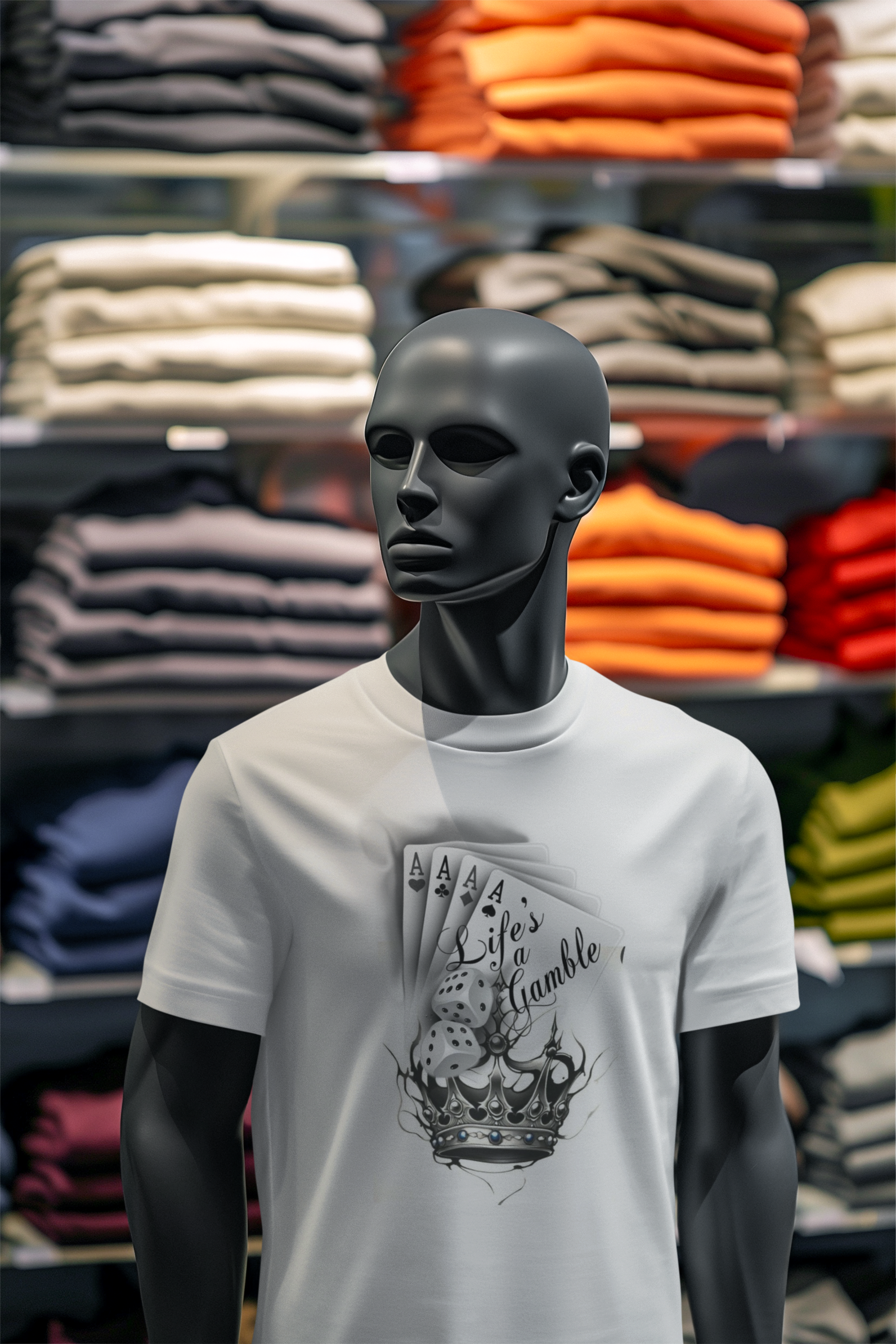 Изрази своя дух на победител с тази уникална тениска с дизайн от карти, зарове и корона – символи на риск, късмет и сила. Надписът "Life's a Gamble" ти напомня, че всяко решение е ход в голямата игра на живота.