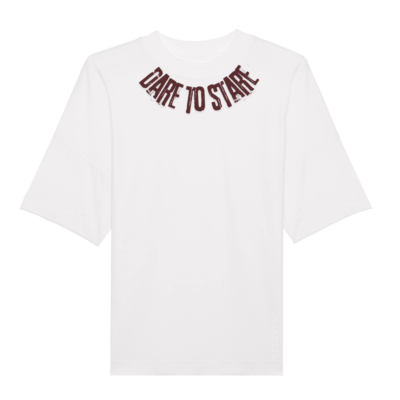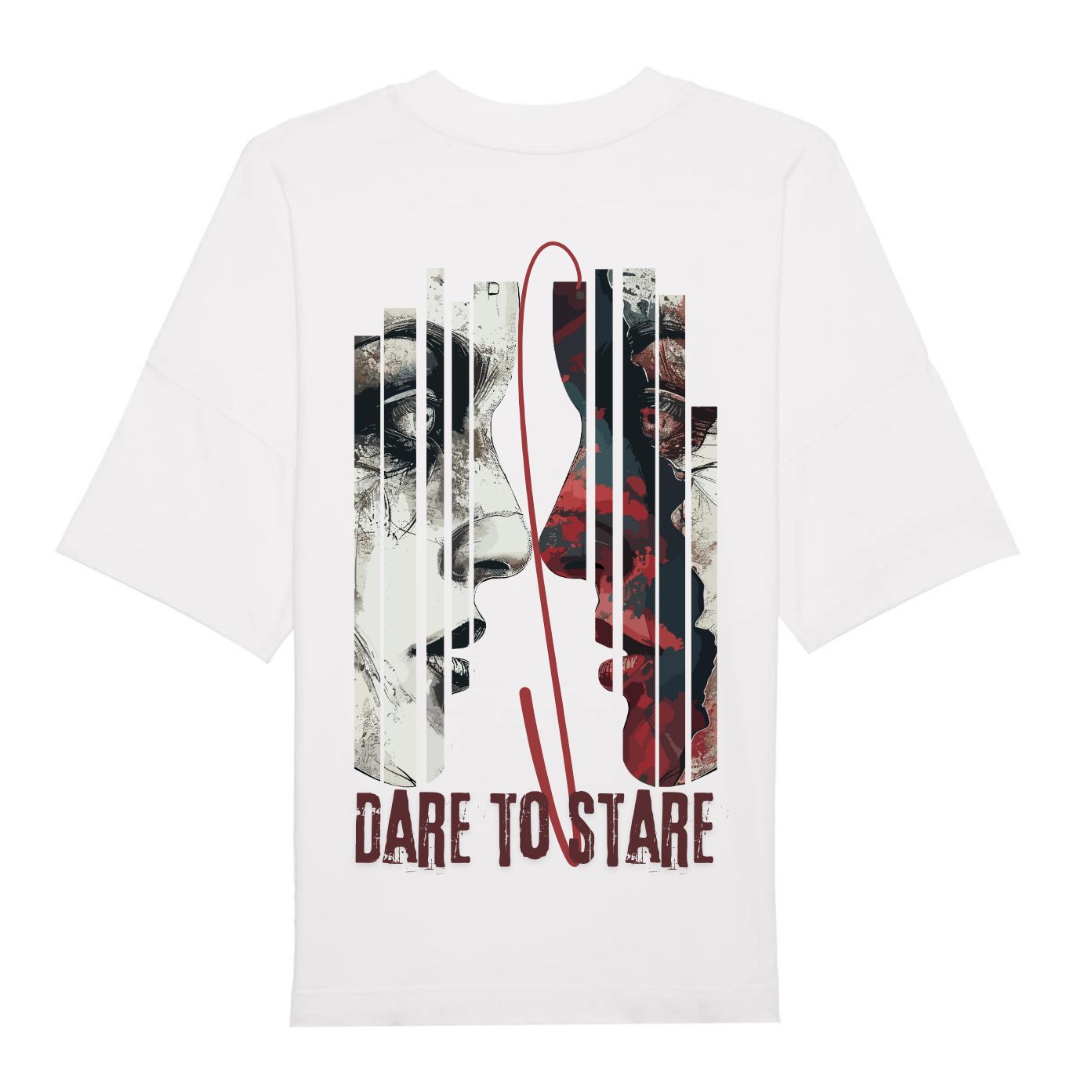 Изразява индивидуалност и дълбочина с този овърсайз тениска "Dare to Stare" , съчетаващ модерен уличен стил с изкуство и силно визуално послание. С провокативен надпис отпред и впечатляваща графика на гърба – две лица в напрегнат поглед един към друг – тази тениска предизвиква внимание и размисъл.