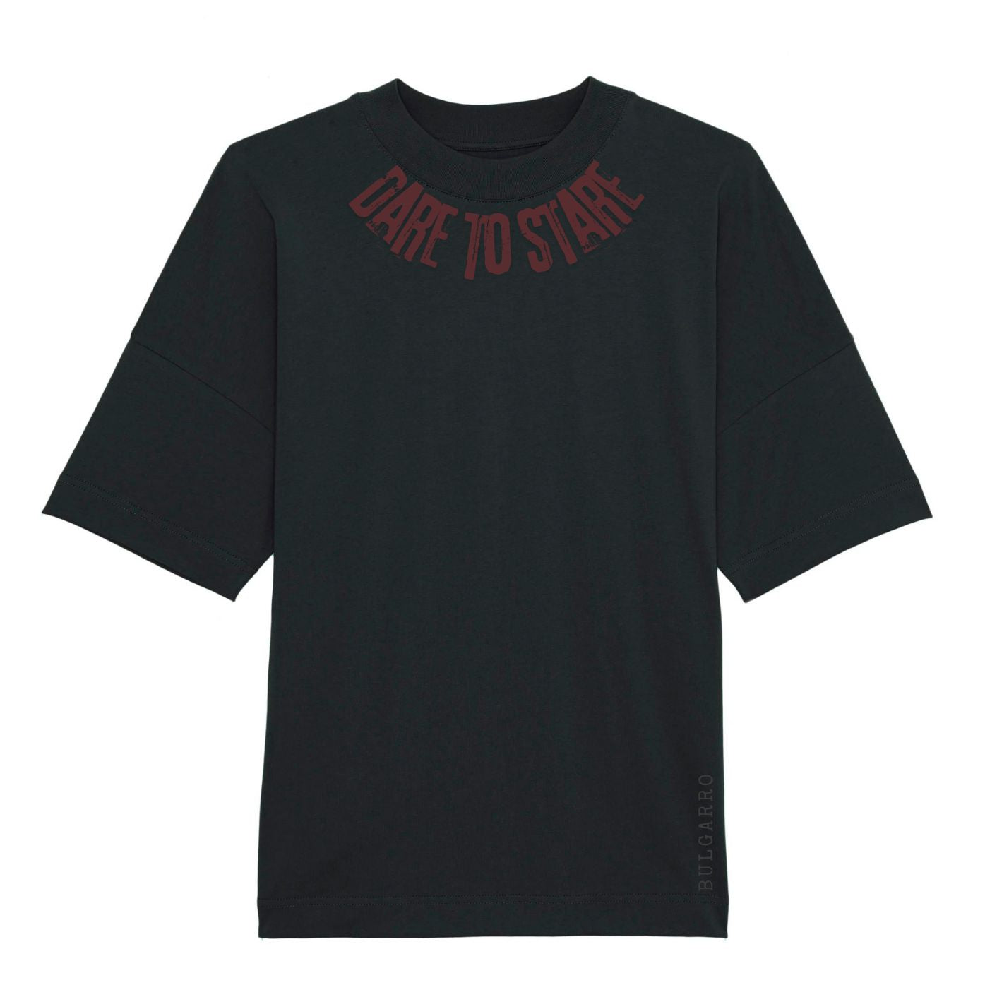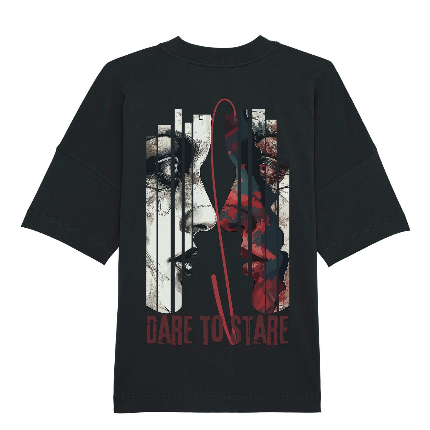 Потопи се в тъмната естетика на уличната мода с тази черна овърсайз тениска "Dare to Stare" , която съчетава артистичен дизайн с дълбоко визуално послание. Предната част е с дискретен надпис около яката, докато драматизмът впечатлява с типична графика – сблъсък между два погледа, изразяващо напрежение, емоция и идентичност.