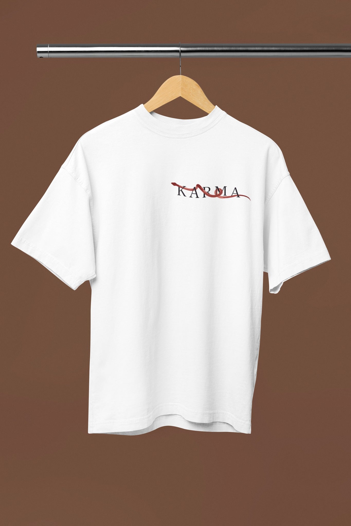 Тениската „Karma“ в овърсайз кройка изпраща ясно послание с минимализъм и стил. Изчистеният надпис "KARMA" и артистичният червен акцент напомня, че всичко се връща – рано или късно. Свободната кройка е създадена за комфорт, свобода и модерно излъчване. Тази тениска е не просто дреха, а израз на вътрешната сила и вяра в справедливостта.