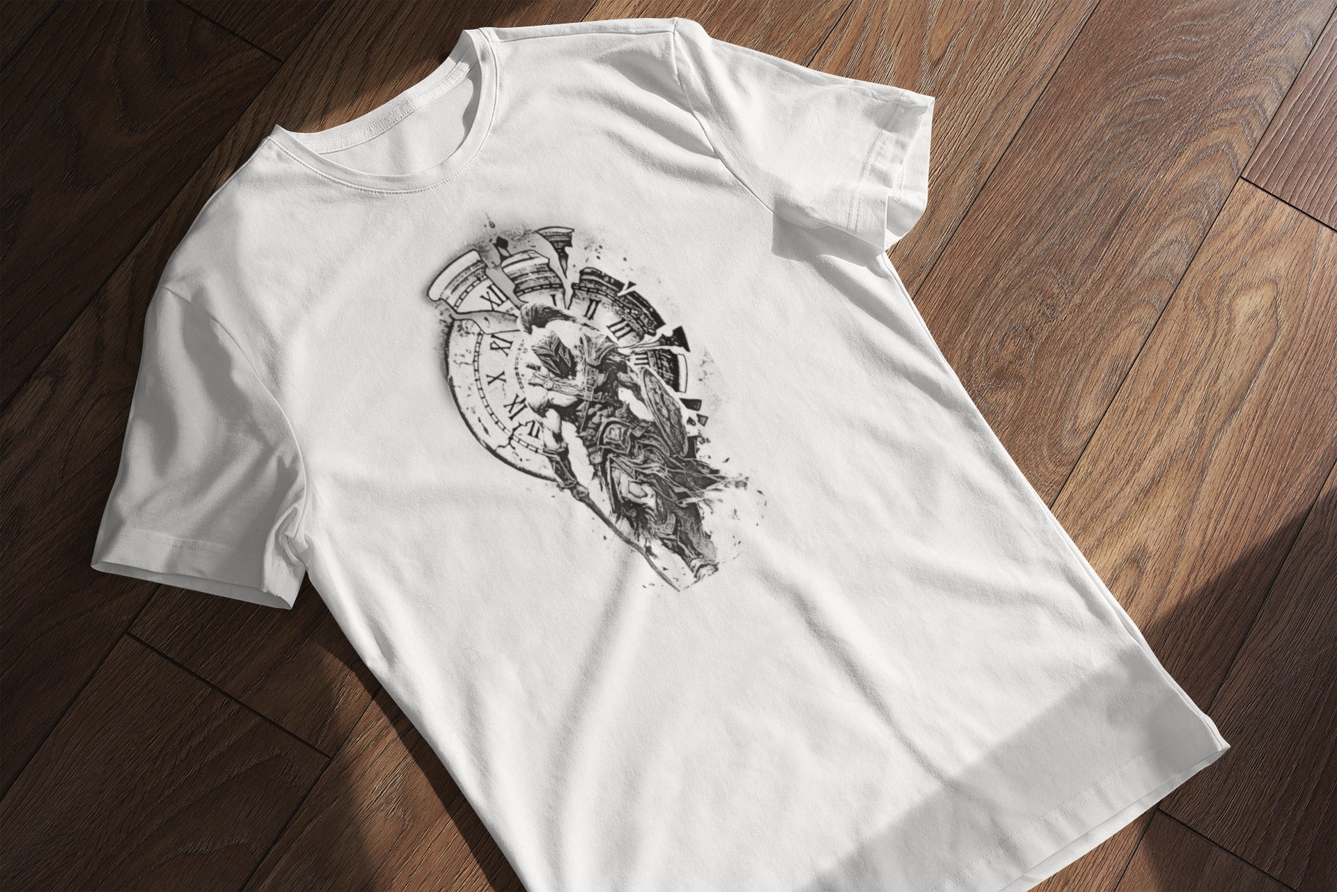 „Timeless Warrior“ е тениска, която носи силно послание – времето не може да спре духа на истинския боец. Артистичният черно-бял принт съчетава класически часовников механизъм и воин с древна броня, създавайки внушителен и мистичен образ. Идеална за фенове на митология, история, фентъзи и символично изкуство.